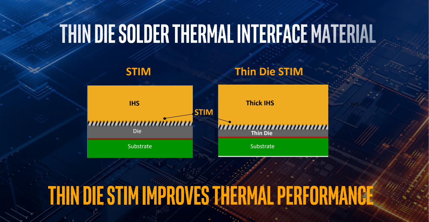125 W giờ tiềm năng OC ra sao? Một giải pháp được Intel áp dụng trên dòng Comet Lake-S đó là giảm z height tức là khiến cho đế chip (die) mỏng hơn đồng thời khiến cho nắp IHS (Integrated Heat Spreader) - nắp kim loại dẫn truyền nhiệt từ die lên bề mặt và là thứ áp trực tiếp với tản nhiệt, trở nên dày hơn. Mục đích là tăng hiệu quả dẫn truyền nhiệt từ đế chip lên tản nhiệt. Intel vẫn dùng lớp STIM để dẫn truyền nhiệt từ đế chip lên nắp IHS, giải pháp vẫn là solder tức bắn dính bằng vật liệu có đặc tính dẫn nhiệt cao (như Core i9-9900K chẳng hạn thì Intel dùng một lớp vàng). Tuy nhiên, không rõ Intel áp dụng thiết kế này trên toàn bộ các phiên bản Comet Lake-S hay chỉ dùng trên các biến thể unlocked để hỗ trợ ép xung.