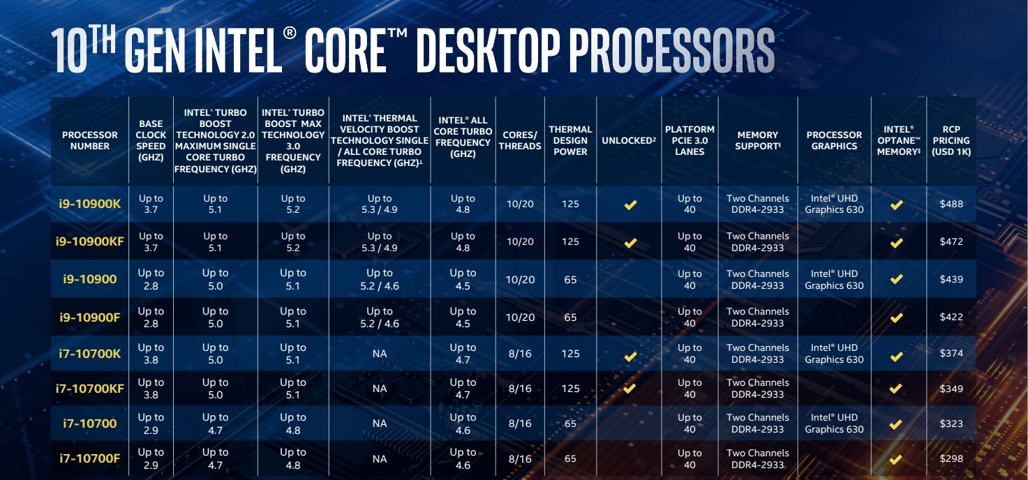 Và như vậy là Intel cũng đã kịp ra mắt những vi xử lý thế hệ 10 (Comet Lake-S) dành cho desktop. Không khác so với những thông tin rò rỉ trước đó, Intel đã mở siêu phân luồng cho tất cả các phiên bản Core i từ i3 đến i9 cùng với giá bán khá hấp dẫn để có thể cạnh tranh tốt hơn với đối thủ AMD.