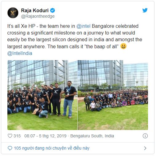 Tài khoản Twitter chính thức của nhóm phát triển chip xử lý đồ họa Intel đã trở thành tâm điểm của sự chú ý vào ngày hôm nay khi đăng tấm hình chip GPU Xe-HP mà họ đang phát triển lên mạng xã hội. Con chip xử lý có kích thước lên tới… 3700mm2, “siêu to khổng lồ” đúng nghĩa đen, vì nếu so sánh với một đối thủ khác là Nvidia Tesla V100S cũng chỉ có kích thước 815mm2, hoặc Quadro RTX4000 cũng chỉ có GPU kích thước 545mm2 mà thôi. Khá chắc chắn rằng, bên trong Xe-HP GPU là vài die GPU kết nối với nhau để tạo ra hiệu năng xử lý tối đa từ phía Intel. Cũng trong những tấm hình này, phó chủ tịch, kiến trúc sư trưởng, giám đốc mảng Kiến trúc, Đồ họa và Phần mềm của Intel, Raja Koduri đã chia sẻ những hình ảnh của nhóm phát triển GPU Intel tại Ấn Độ. Họ gọi con chip xử lý đồ họa này là “baap of all”, dịch từ tiếng Ấn sang là “father of all”.