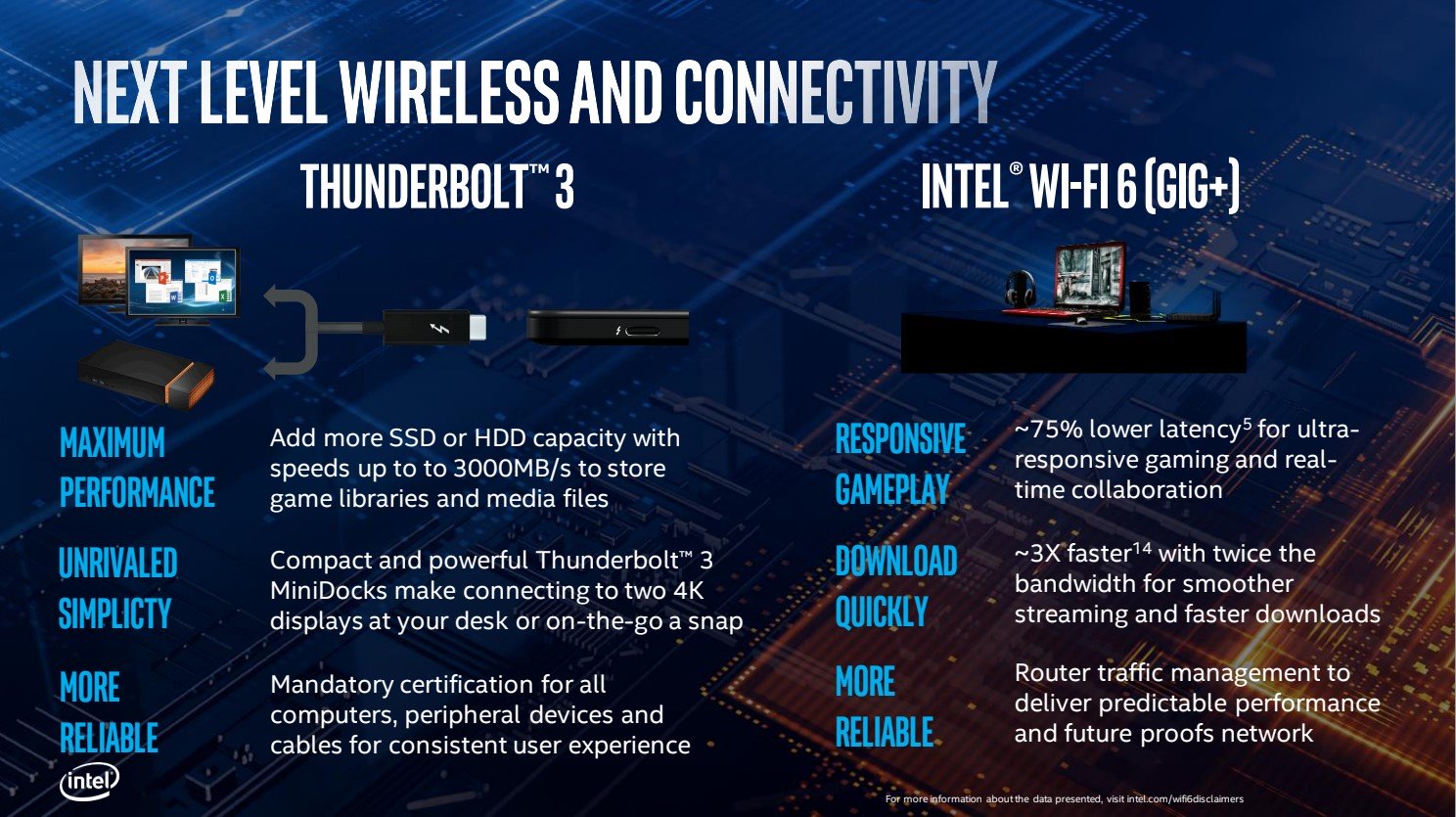 Modem Wi-Fi 6 AX201 (Gig+) đã được tích hợp nhưng vi điều khiển Thunderbolt 3 lại không, khác với dòng Ice Lake. Việc không tích hợp là để tạo sự linh hoạt cho các OEM bởi Thunderbolt 3 sẽ khiến giá thành CPU cao hơn và không phải lúc nào hãng sản xuất laptop cũng cần trang bị Thunderbolt 3 trên những chiếc máy gaming hay máy cấu hình cao bởi những chiếc máy này đã có GPU rời.