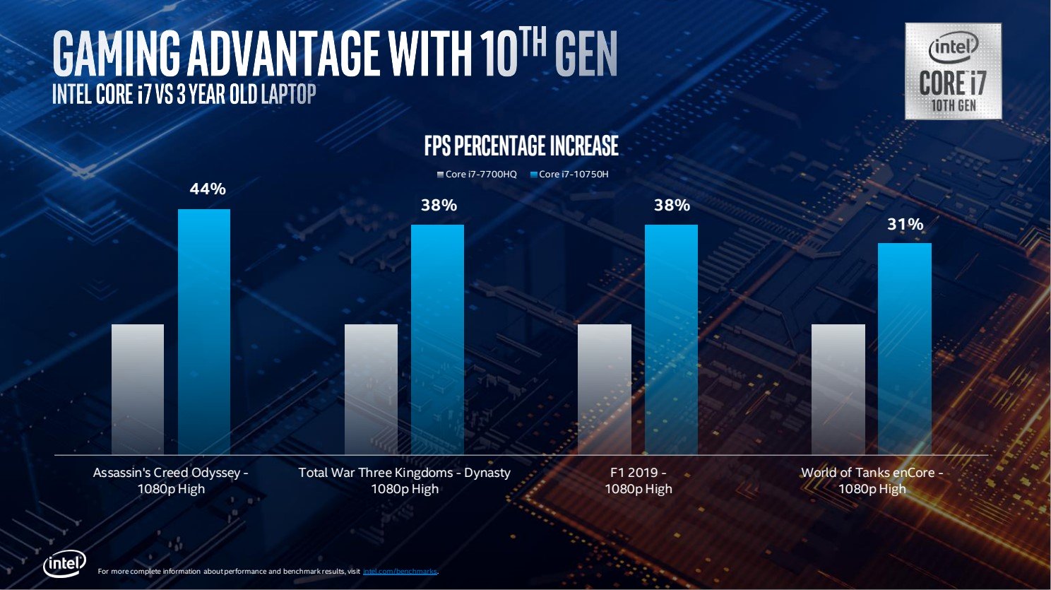 Hiệu năng của dòng Comet Lake-H cũng được Intel thể hiện khi so sánh với thế hệ Kaby Lake-H (đời 7). Core i9-10980HK với 8 nhân 16 luồng hiển nhiên đạt hiệu năng cao hơn nhiều so với Core i7-7820HK