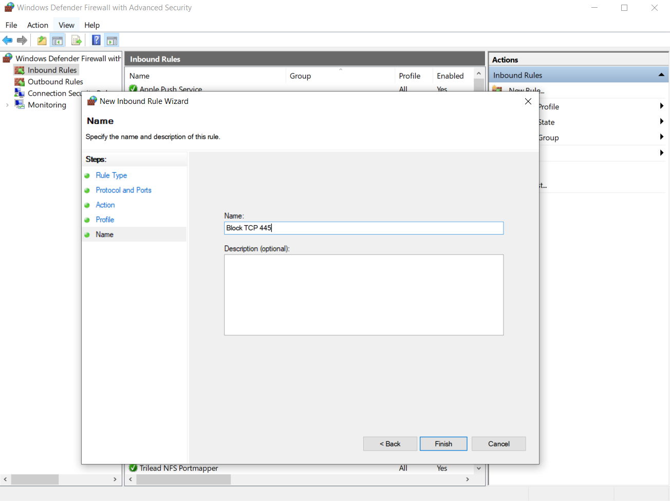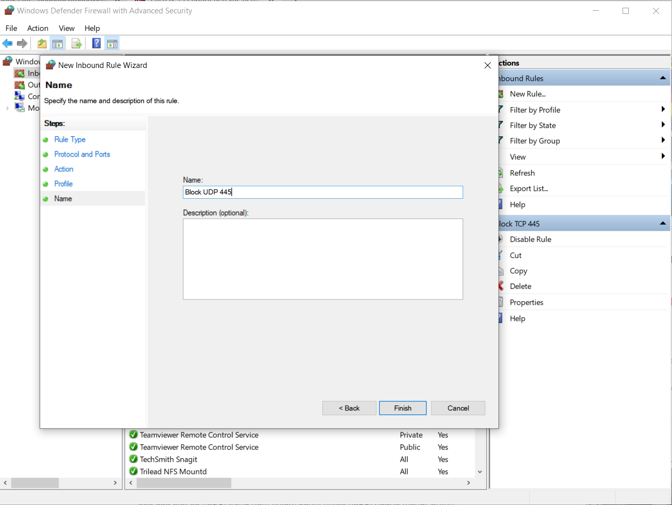 - Nhấn Finish để hoản thành block port 445 UDP