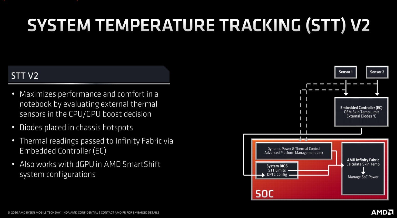 AMD khai thác hệ thống theo dõi nhiệt độ STT V2 và từ diagram thì có thể hình dung dữ liệu từ 2 cảm biến nhiệt (diode nhiệt) gắn tại những điểm phát sinh nhiều nhiệt của máy sẽ được gởi đến vi điều khiển nhúng (EC) và một phần được gởi đến DPTC (Dynamic Power & Thermal Control) - một giao tiếp cho phép hệ thống điều khiển điện của APU có thể được tùy chỉnh và thay đổi ngay lập tức bởi các nguồn bên ngoài chẳng hạn như thiết lập từ BIOS. Dữ liệu từ EC được BIOS sử dụng để đưa ra các thiết lập về giới hạn nhiệt độ vỏ và điện năng cho DPTC. Nhiệt độ vỏ máy được tính toán từ đó đưa ra mức điện năng hoạt động phù hợp cho APU, dữ liệu này được gởi đi qua cầu Infinity Fabric.