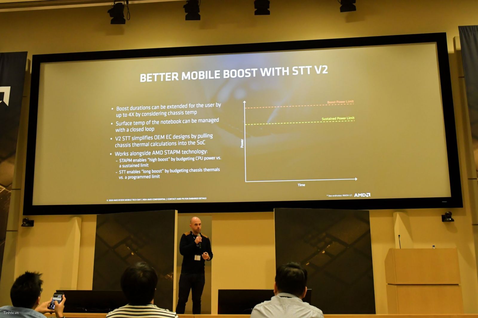 STT V2 hoạt động song song với công nghệ STAPM (AMD Skin Temperature Aware Power Management) - quản lý điện năng dựa trên nhiệt độ vỏ máy. STAPM cho phép vi xử lý đẩy lên xung cao nhất trong một thời gian ngắn hơn tùy thuộc vào giới hạn điện năng và nhiệt theo thiết kế trong khi STT V2 sẽ giúp vi xử lý giữ xung cao trong thời gian dài hơn theo giới hạn nhiệt của máy (đo từ cảm biến vỏ) trước khi hạ xuống mức xung toàn nhân. Nếu anh em để ý thì các phiên bản Ryzen Mobile 4000 series đều có mức xung Boost cao hơn rất nhiều so với Ryzen Mobile 3000 series, chưa kể là số nhân gấp đôi. Chẳng hạn như Ryzen 7 4800H 8 nhân 16 luồng có xung cơ bản 2,9 GHz - Boost đến 4,2 GHz trong khi Ryzen 7 3750H 4 nhân 8 luồng có xung cơ bản 2,3 GHz và Boost 4 GHz.