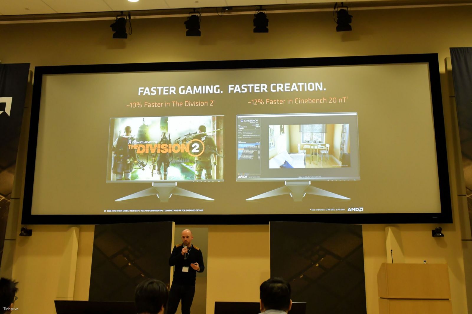 Kết quả là? Anh em hình dung khi chơi game, những tựa game nào ăn nhiều GPU (GPU bound) thì mức usage của GPU luôn ở mức rất cao và xung của GPU cũng được đẩy lên cao từ đó phát sinh nhiều nhiệt hơn trong khi CPU không bị chiếm dụng quá nhiều. Lúc này SmartShift sẽ can thiệp bằng cách điều tiết điện năng cho CPU ở mức cần thiết và ưu tiên điện năng cho GPU để đạt hiệu năng tốt hơn từ đó hệ thống tản nhiệt sẽ có thể hoạt động hiệu quả hơn thay vì quá tải vì cả 2 linh kiện đều ăn nhiều điện cùng lúc và cùng phát sinh nhiều nhiệt. AMD cho biết SmartShift sẽ cải thiện đáng kể hiệu năng khi chơi game, chẳng hạn như cho khung hình cao hơn 10% với tựa game The Division 2 và hiệu năng cao hơn 12% với bài test Cinebench R20 đa nhân đa luồng.