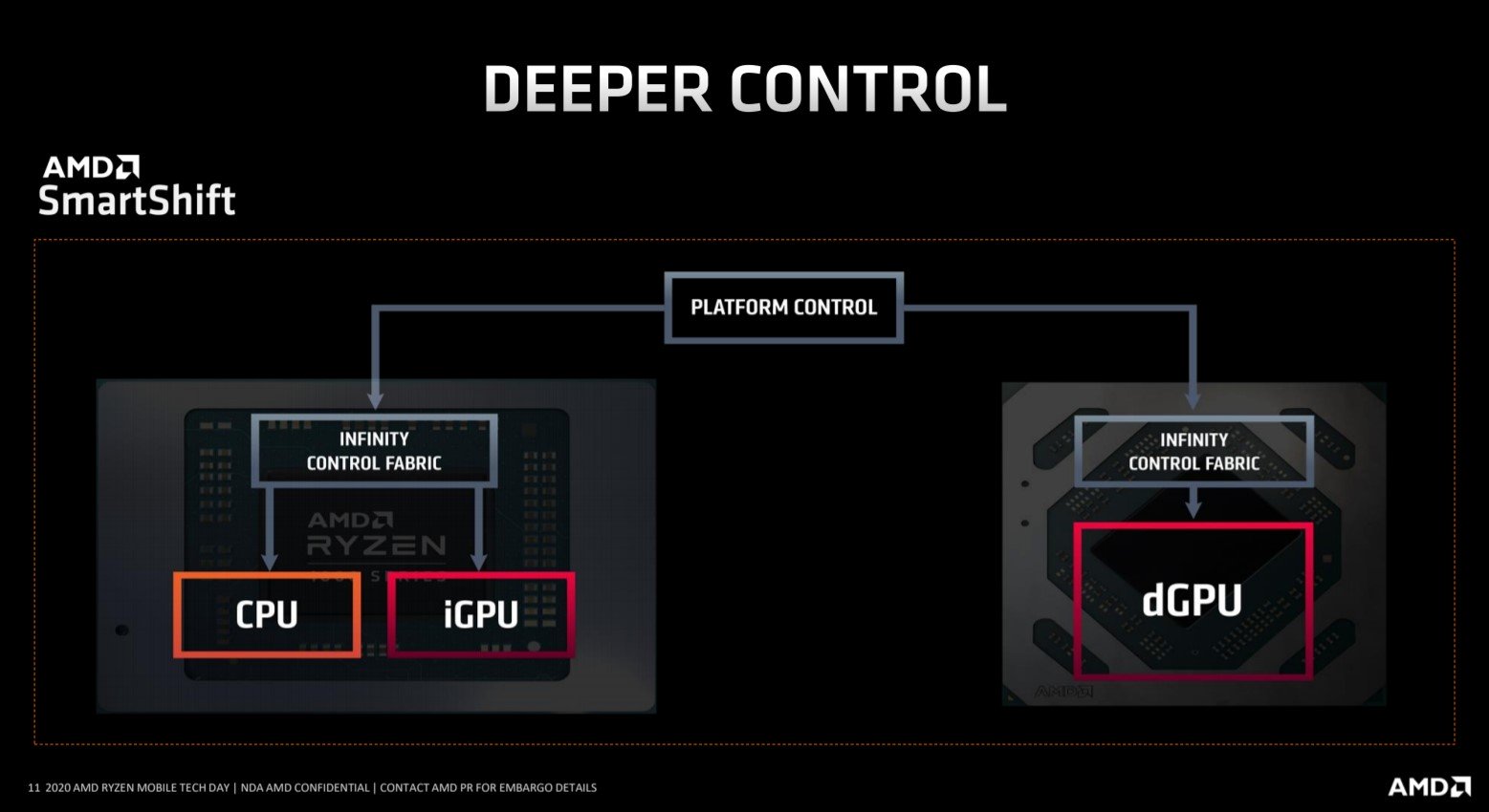 SmartShift hoạt động như thế nào? DPTC cùng với STAMP thiết lập DPTC trong BIOS sẽ hỗ trợ cho SmartShift quản lý điện năng cho APU và GPU rời thông qua cầu Infinity Fabric. Từ đó nó sẽ tự động chuyển đổi thông minh điện năng cho CPU và GPU tùy theo yêu cầu của mỗi thành phần.