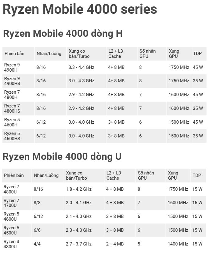Bản thân dòng Ryzen Mobile 4000 series đã được cải tiến rất nhiều từ kiến trúc Zen 2 7nm và nhân đồ họa tích hợp cũng mạnh hơn. APU vẫn có 2 cụm CCD (Core Chiplet Die), mỗi cụm chứa 2 CCX (CPU Complex) và mỗi CCX có 4 nhân, thiết kế này cho phép AMD tăng số nhân xử lý lên thành 8 nhân 16 luồng trên cả phiên bản H hiệu năng cao lẫn U tiết kiệm điện. Đây cũng là lần đầu tiên một con vi xử lý tiết kiệm điện với TDP 15 W có đến 8 nhân, Intel chưa thể đạt được số nhân này trên dòng Core i thế hệ 10.